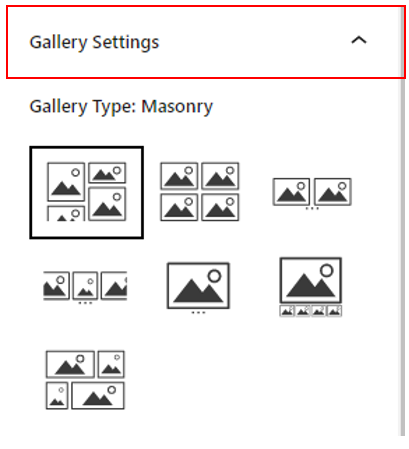 To change the layout of the images in the gallery go to the sidebar Block > Gallery Settings > Gallery Type