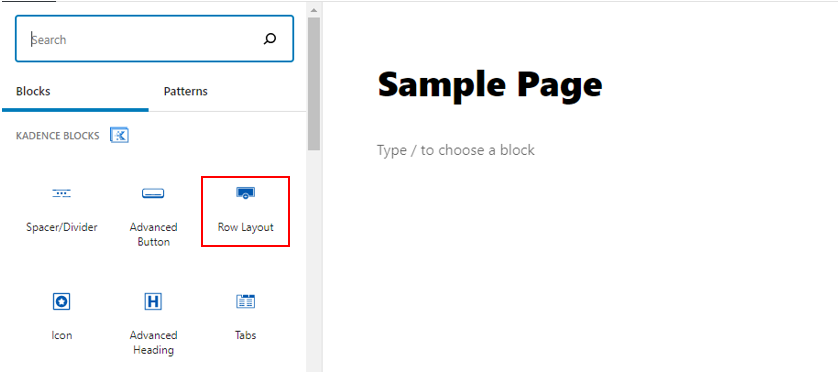 From the sidebar select Row Layout from the Kadence Blocks section